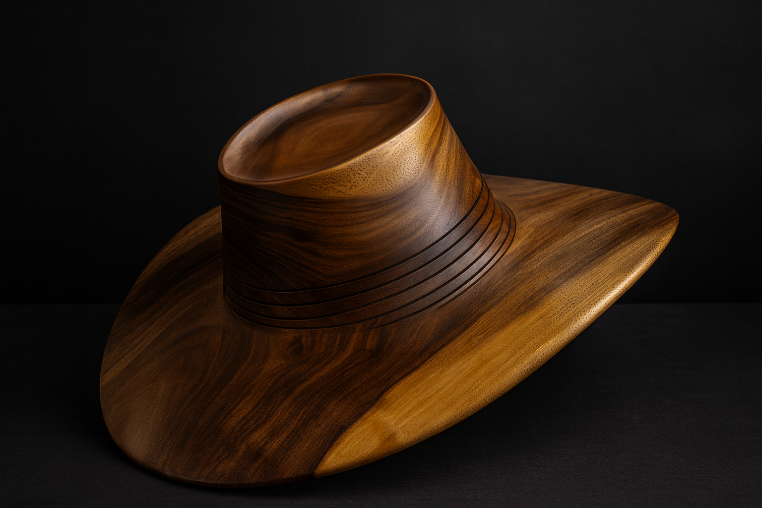 One-of-a-kind, full-size cowboy hat turned entirely from rich American walnut. A true showcase of artistry and patience — shaped, hollowed, and finished by hand.