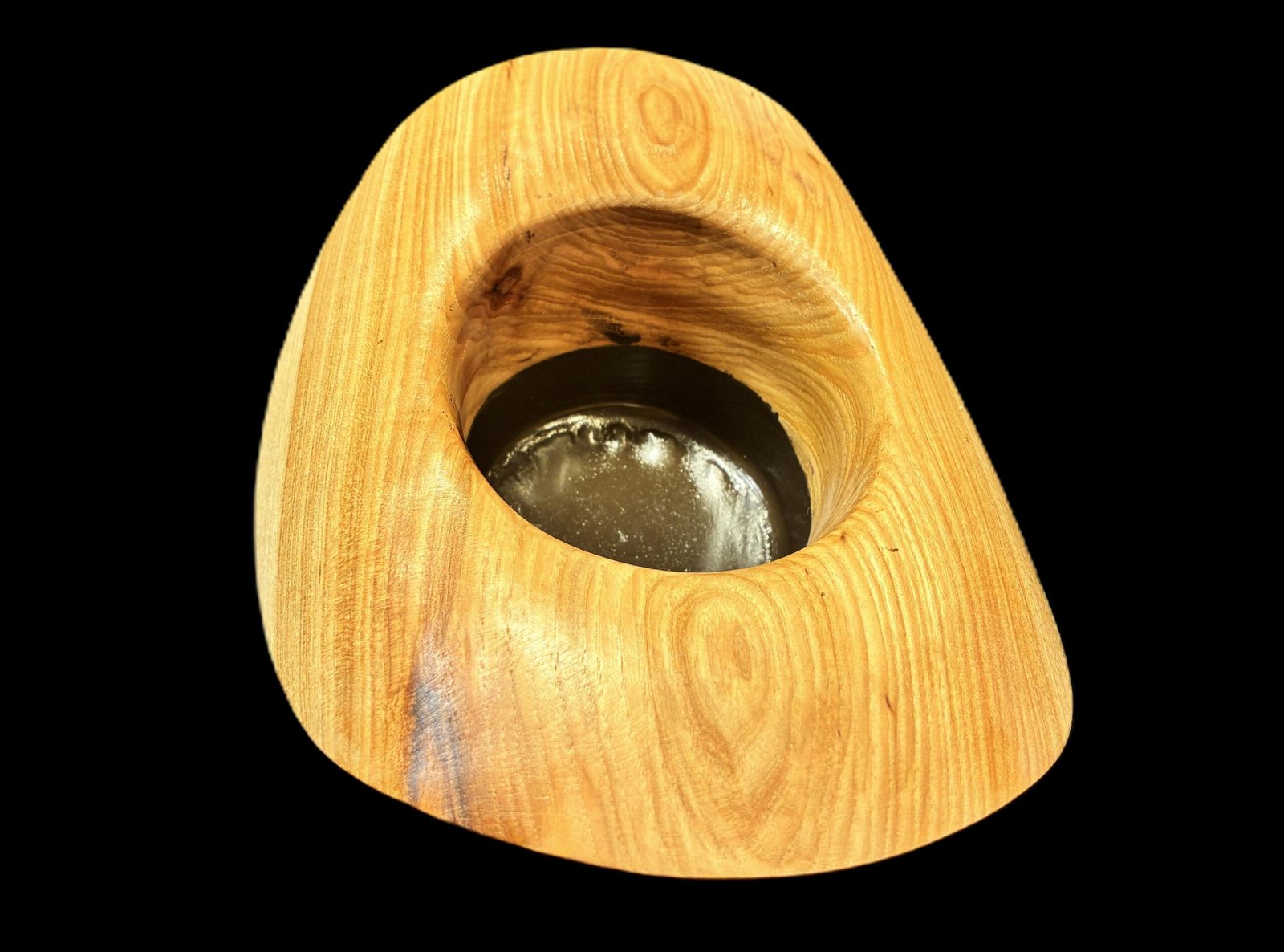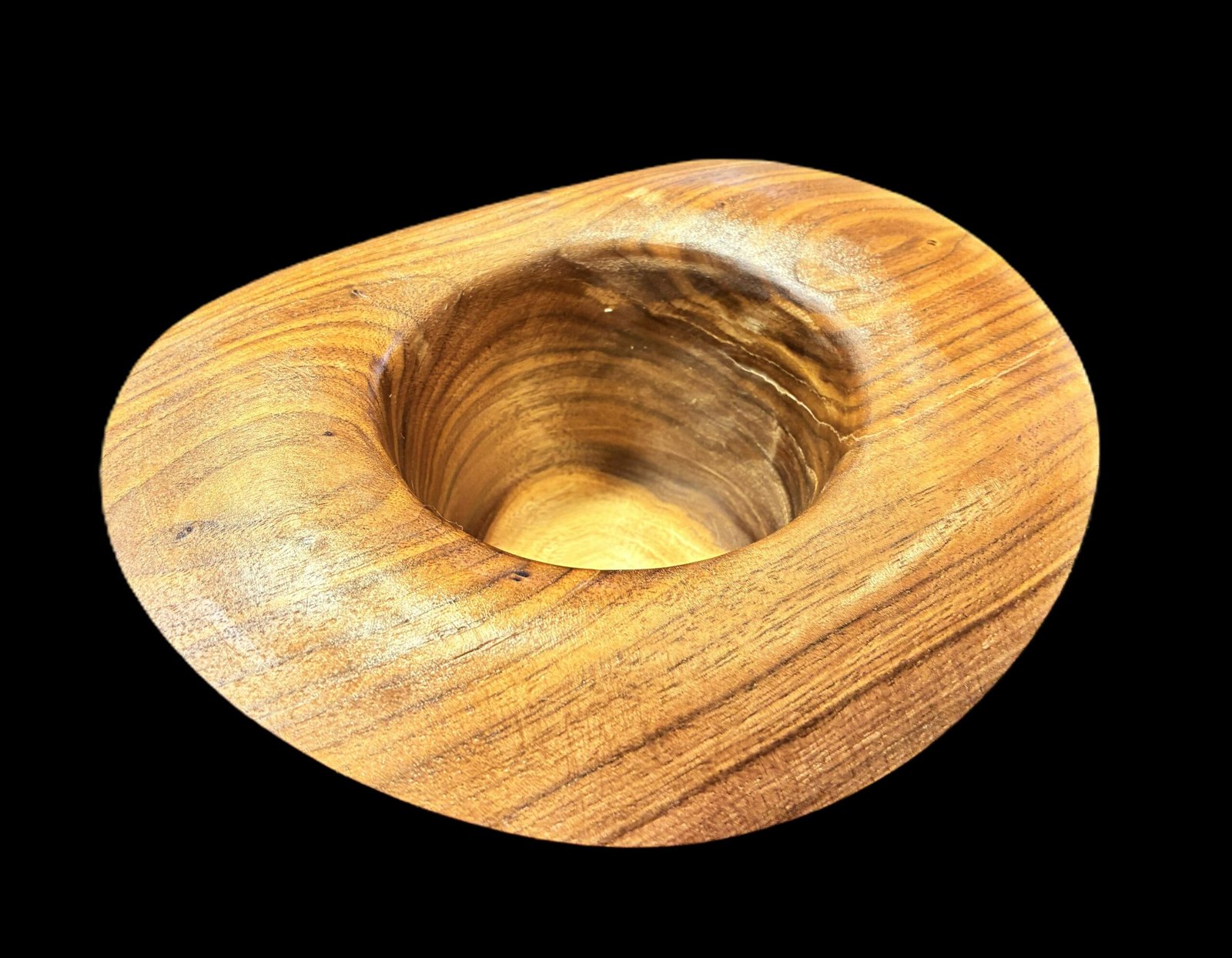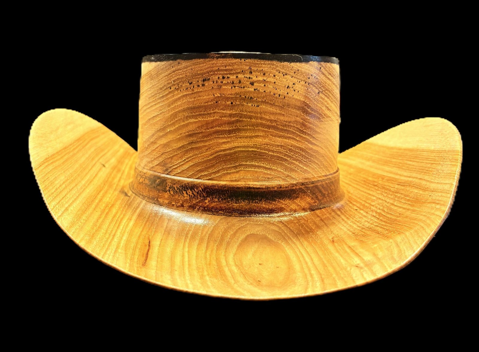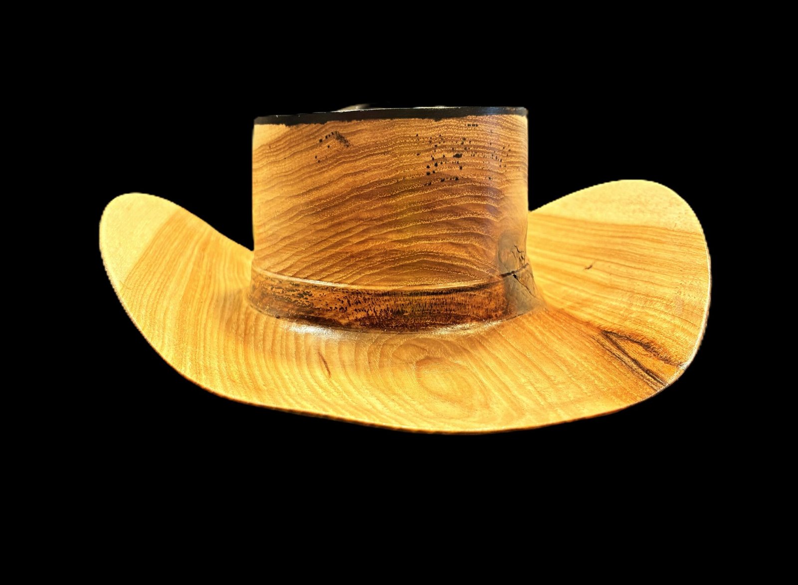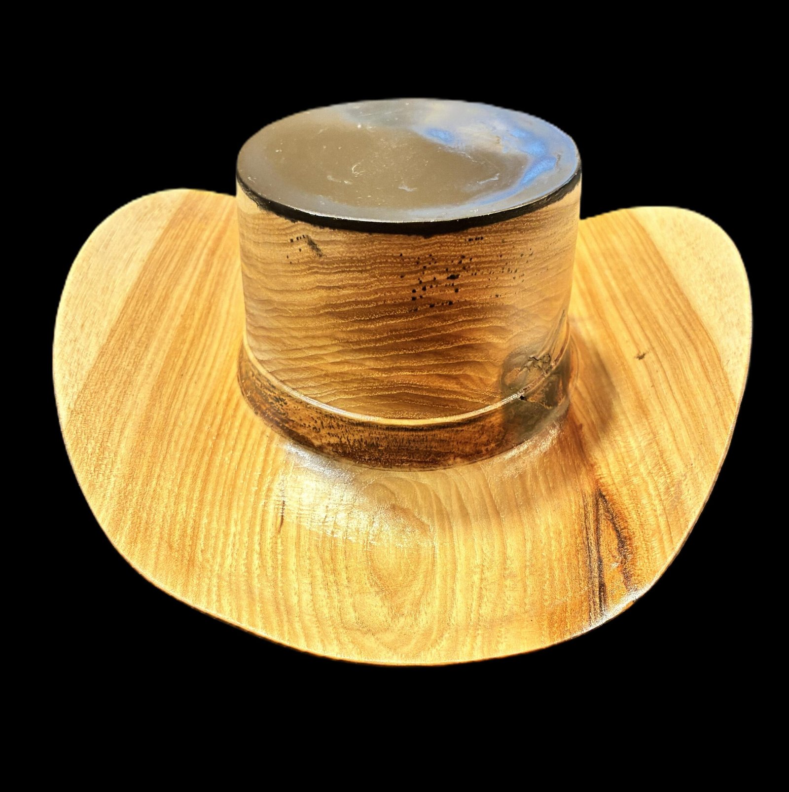 Hand-turned from solid hickory, this decorative cowboy hat showcases the natural strength and rich grain of the wood. The form is smooth and balanced, shaped with precision to highlight the natural tones and gentle curve of the brim. The top features a clear, polished finish that subtly enhances the wood’s character and provides a durable accent.