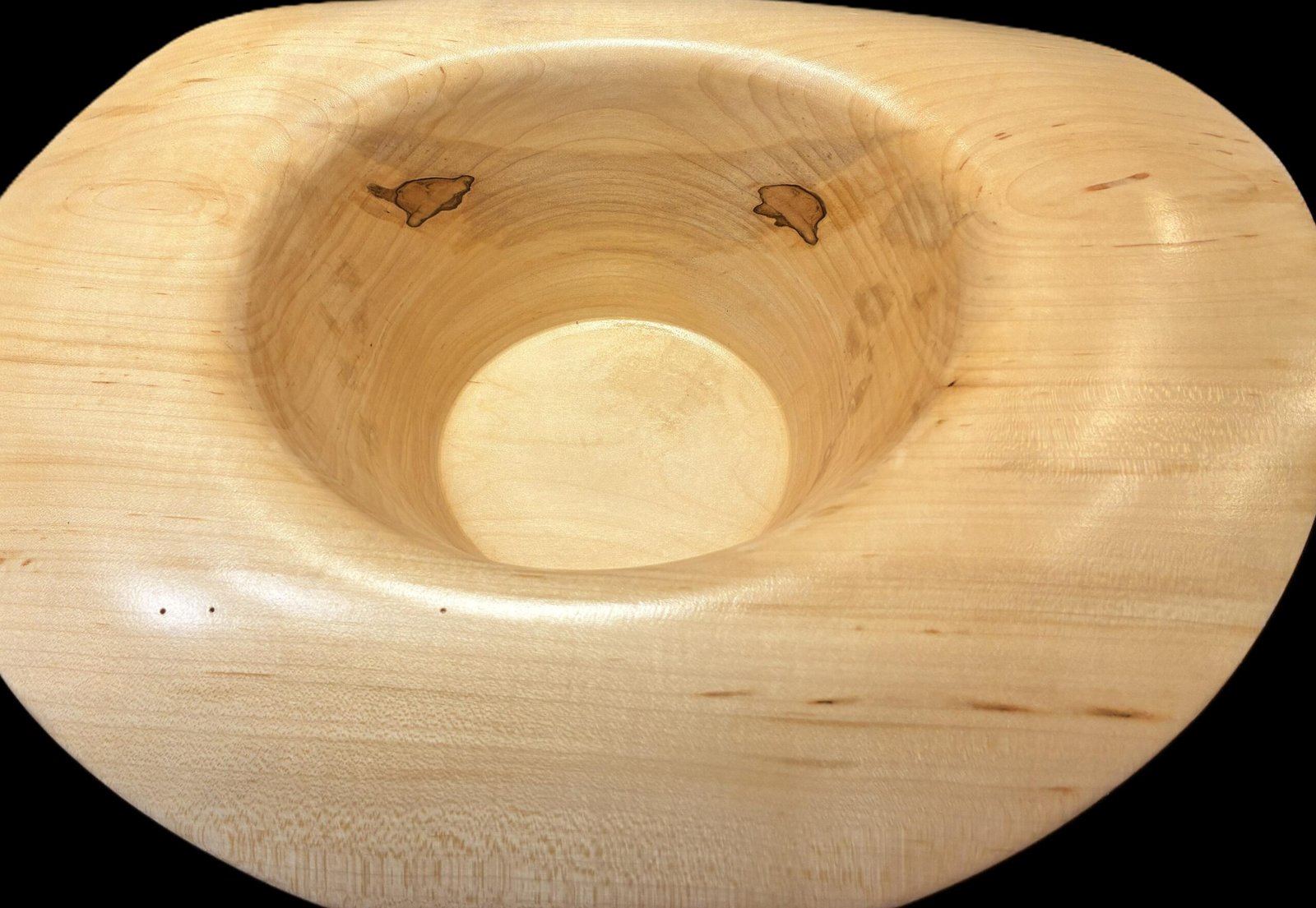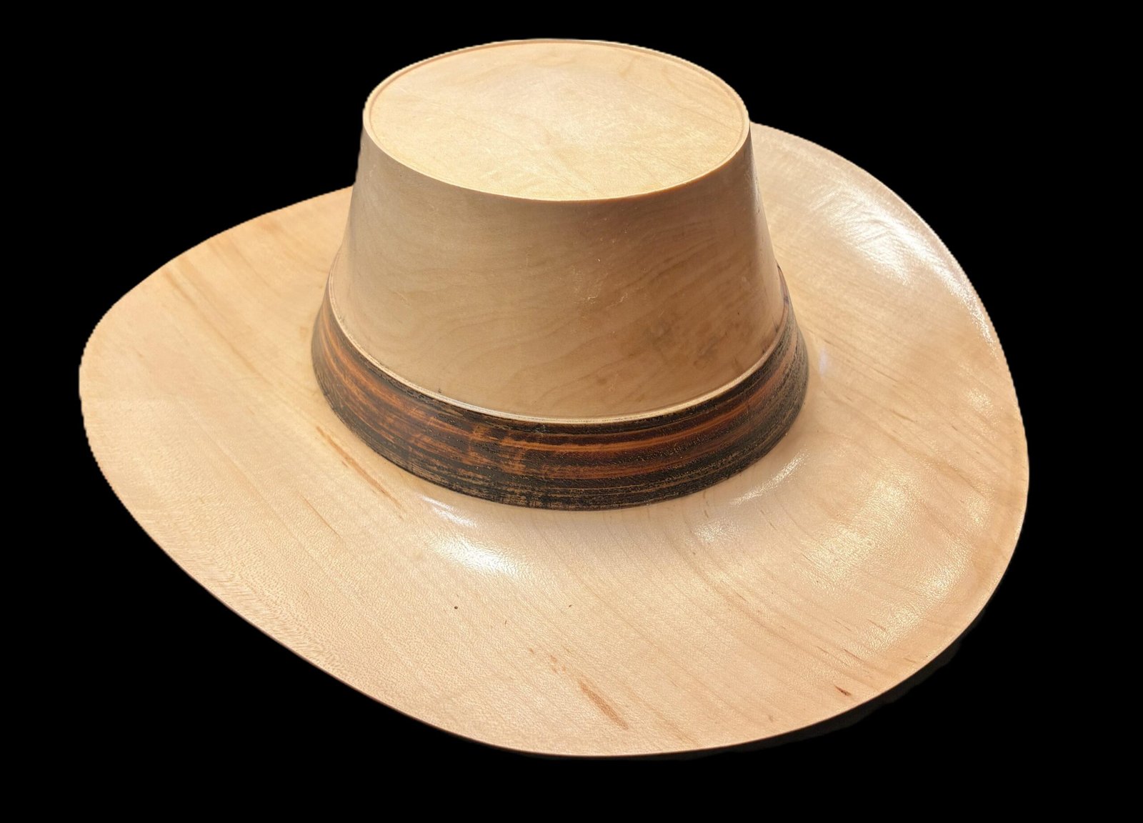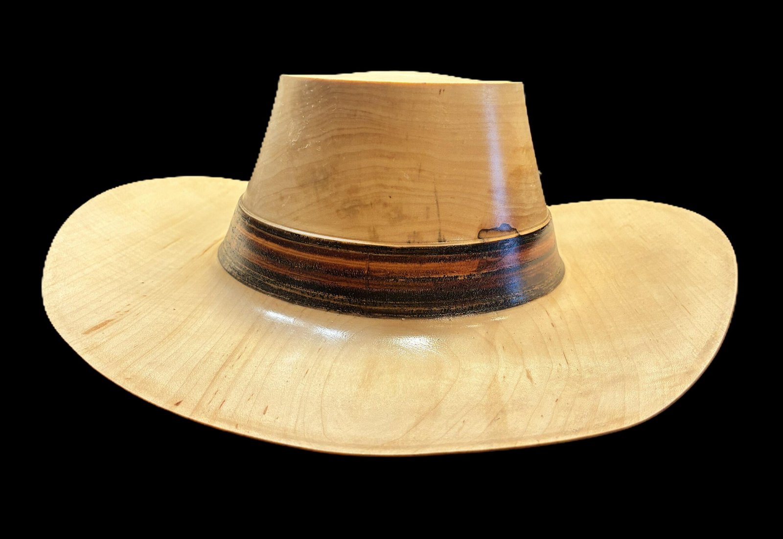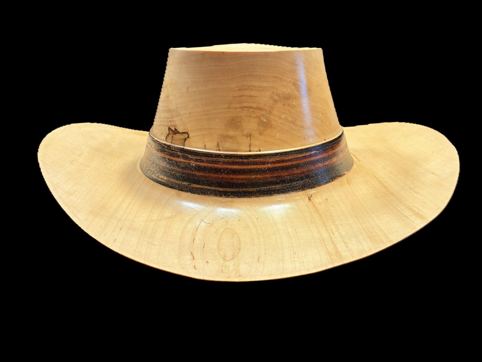 This full-size cowboy hat was hand-turned from solid hickory, known for its strength, density, and striking grain patterns. The wide sweeping brim and smooth crown are shaped entirely by hand, then carefully finished to highlight the natural tone variations of the wood. Around the base of the crown, a darkened band was created using walnut pressure-burning — a traditional technique that leaves a deep, rich contrast and gives the hat a classic, time-worn look.